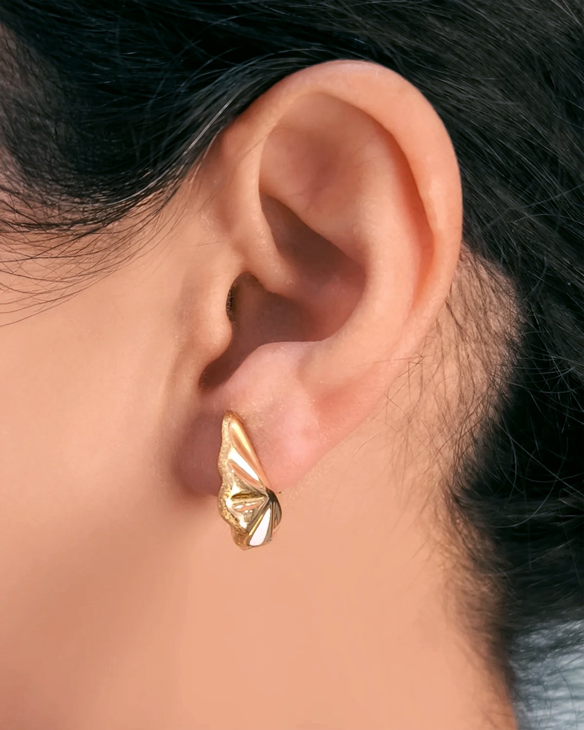 , İtalyan tarzında deniz kabuğuna benzeyen özel tasarım altın küpe, zarafeti ve şıklığı bir araya getirerek dikkat çekiyor. Bu muhteşem takı, her türlü kıyafetle mükemmel uyum sağlar.